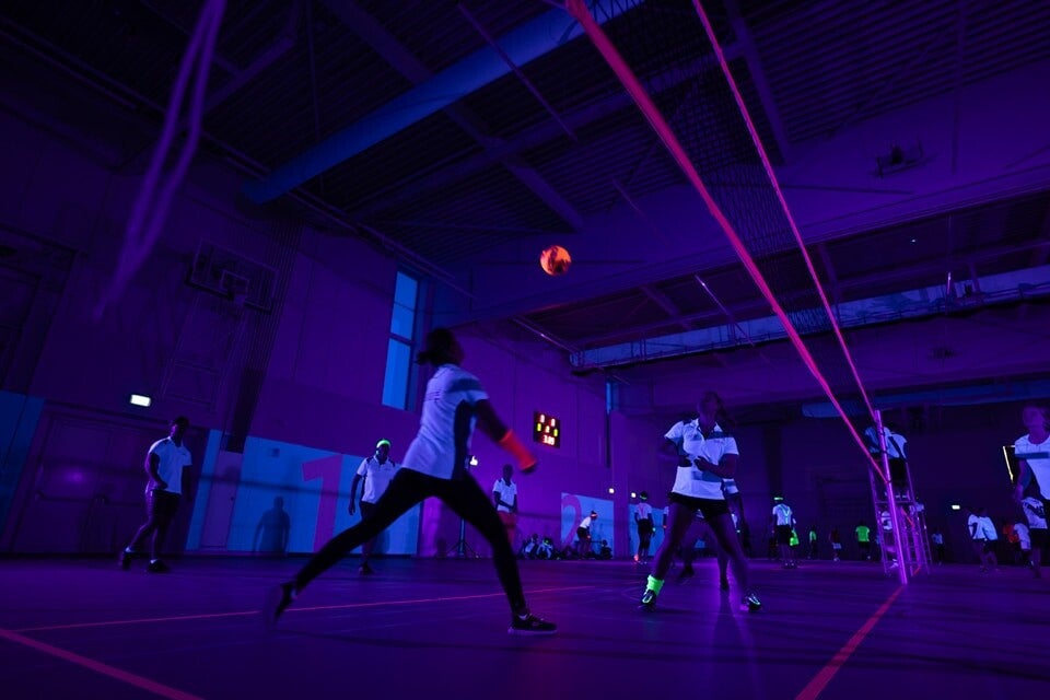 Hoe gaaf is dat! In het donker volleyballen met neon lichten.